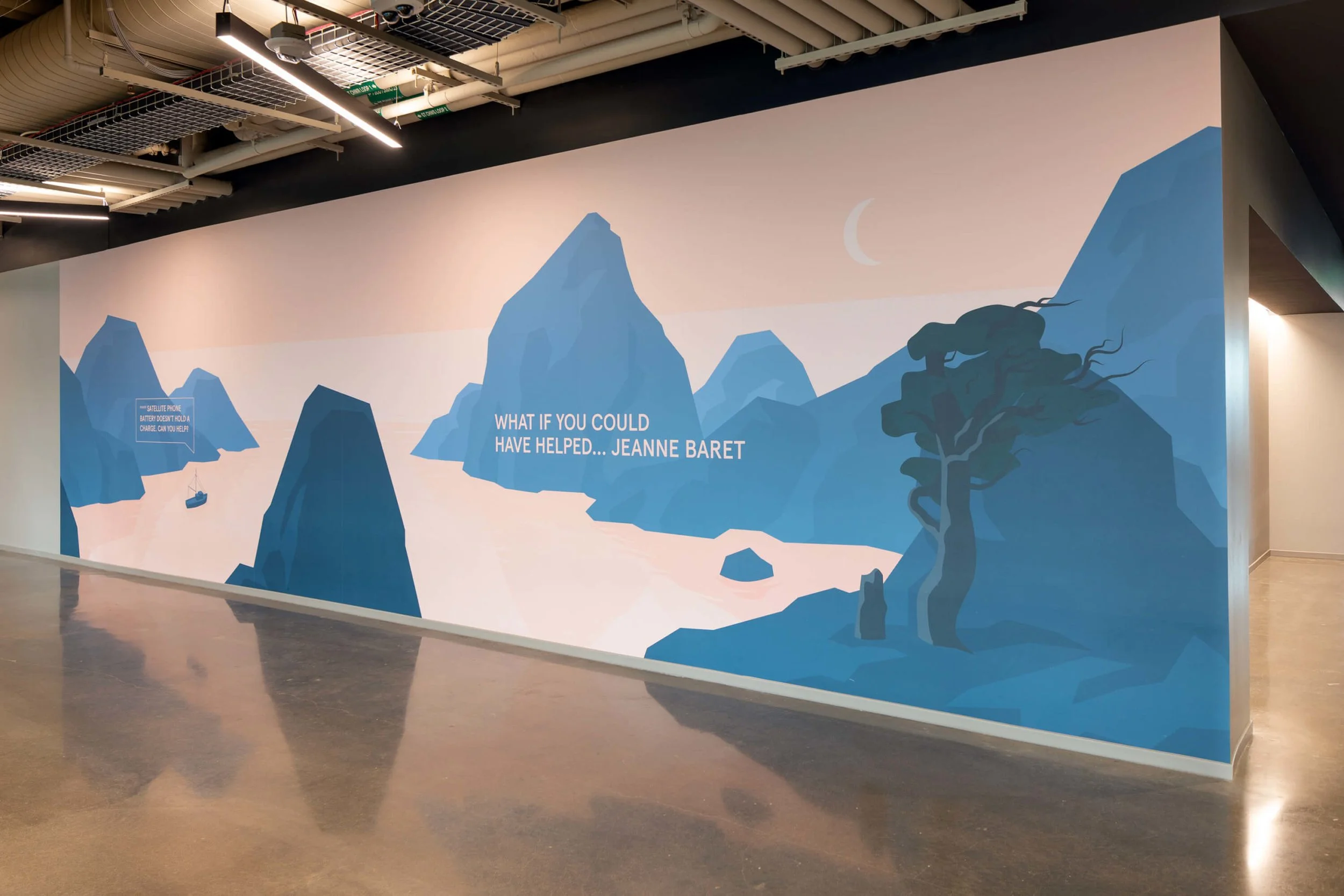 Work spaces feature a series of 30 original wall illustrations that imagine how Asurion might have helped historic—as well as contemporary—figures. Testimonials from Asurion customers, and a day/night cityscape come together in an installation that reminds employees of the real world positive impact of their work.